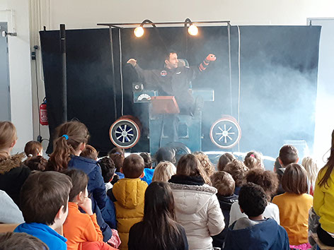 Avec sa "marionnette chaussette", le fameux Lombric Fourchu, il part explorer le monde de l’Economie Circulaire. Objectif : faire découvrir les ressources naturelles de la terre et sensibiliser à sa protection. 45 minutes de spectacle qui ont ravi les 500 élèves et leurs professeurs, enchantés par ce voyage spatial.
