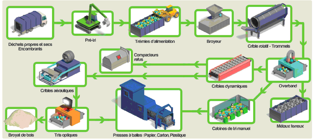 A leur arrivée sur les chaînes de traitement, les encombrants subissent un pré-tri. Ils sont ensuite broyés, puis séparés en fonction de leur granulométrie grâce à un trommel. Les différentes fractions subissent alors un tri hydrodynamique et un tri optique afin d’en extraire bois, fibreux, plastiques et CSR*.